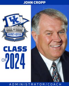 Served UK athletics for 22 years, including assistant football coach (1991), athletics recruiting coordinator (1992-93), assistant athletics director for special projects (1993-95) and associate athletics director (1997-2013) … Among numerous other responsibilities, he was founding administrator for UK softball in 1997 and John Cropp Stadium was named in his honor upon his retirement in 2013 … Noted for his dedication to the student-athlete, he served in coaching/administration for almost half a century at UK, Texas Tech, Ole Miss, Duke, Vanderbilt and in high school … Won a national championship as a high school head football coach … Served four years as a lieutenant in the U.S. Army … Elected to the Tennessee Sports Hall of Fame.