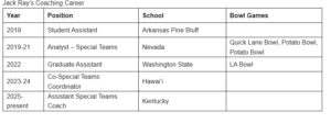 “We’re excited to have Jack Ray join our staff and assist Coach Boulware with special teams,” Stoops said. “He brings great energy, attention to detail, and a strong understanding of the game. Special teams are a critical part of what we do, and I’m confident he will make an immediate impact with our players and our program.